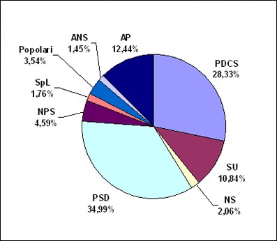 (*) Il raffronto del risultato del 2001 del PD con quello del 1998 č stato ottenuto assommando, nella consultazione del 1998, i voti ottenuti dalle liste SR e PPDS-IM-CD che, nel frattempo, hanno dato luogo ad una fusione costituendo il PD.