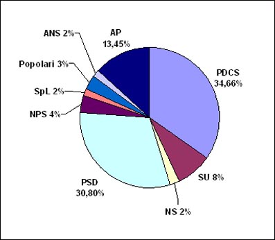 (*) Il raffronto del risultato del 2006 del PSD con quello del 2001 è stato ottenuto assommando i voti ottenuti dalle liste PSS e PD che, nel frattempo, hanno dato luogo ad una fusione costituendo il PSD, mentre Il raffronto del risultato del 2006 di SU con quello del 2001 è stato ottenuto dall'unione de partito di RCS e di Zona Franca che nel 2001 non si era costituito.